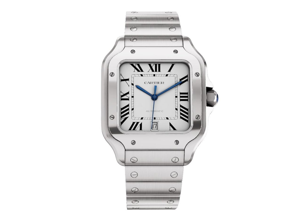 Santos watch, large model, mechanical movement with automatic winding, caliber 1847 MC. Steel case, 7-sided crown set with a faceted synthetic spinel, silvered opaline dial, steel sword-shaped hands, sapphire crystal. Steel bracelet with “SmartLink” adjustment system. Case width: 39.8 mm, thickness: 9.38 mm. Water-resistant up to 10 bar (approx. 100 meters/328 feet).